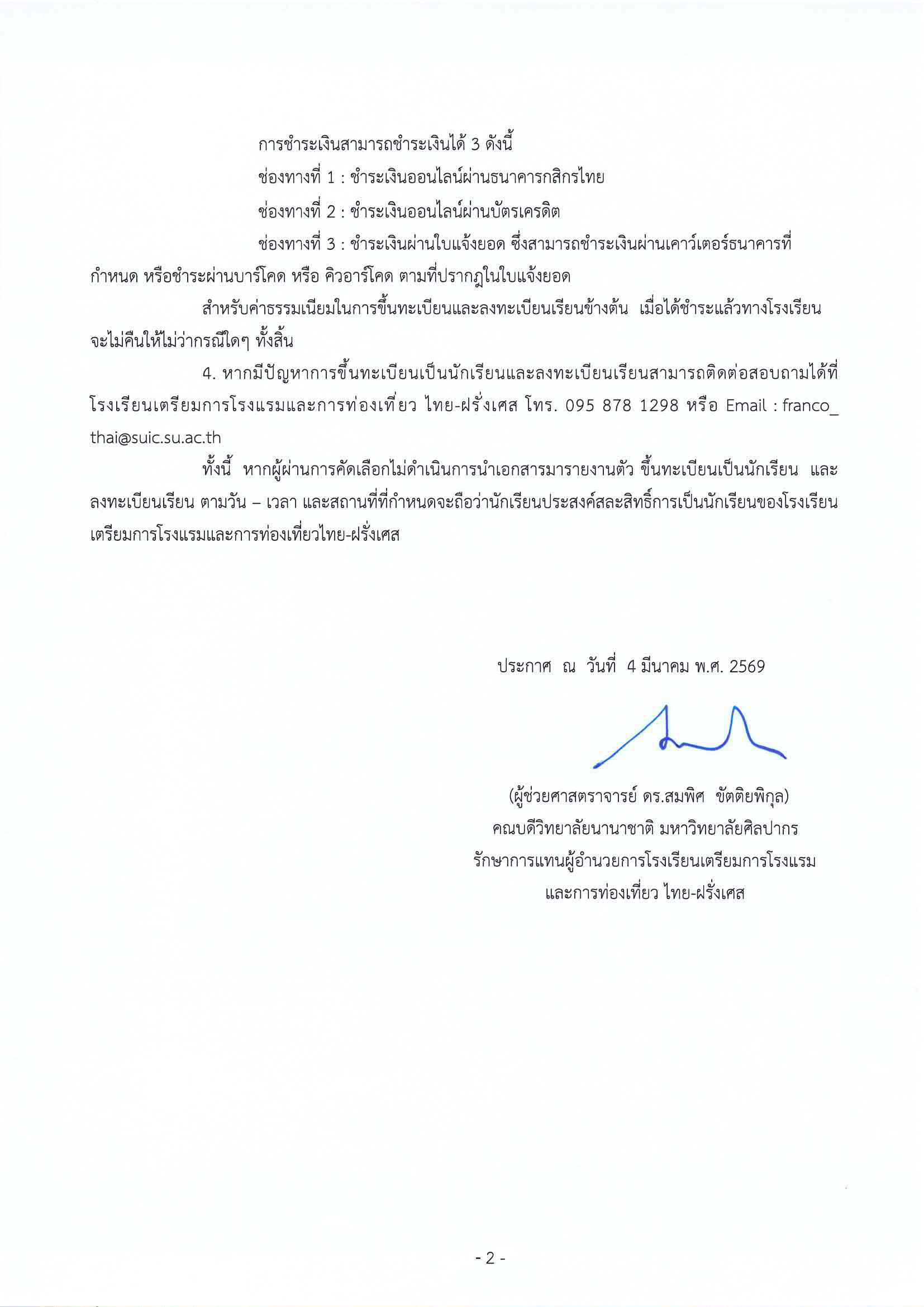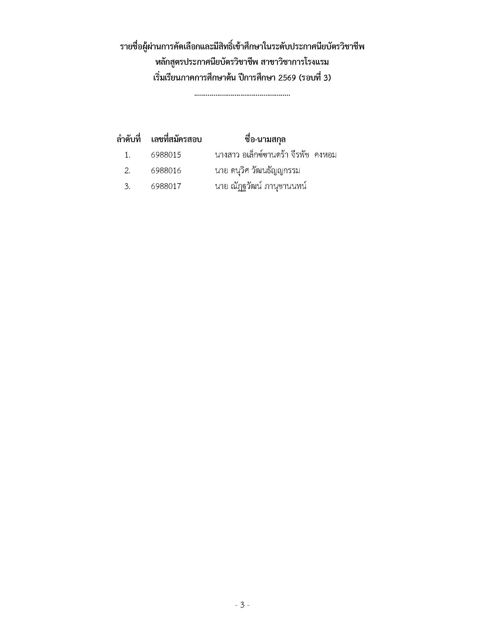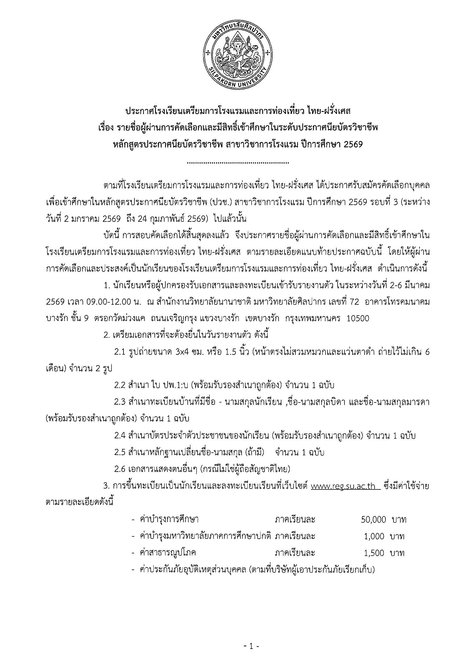 As previously announced by the Franco-Thai Hotel and Tourism Preparatory School for Hotel and Tourism, the selection process of new students for the Vocational Certificate in Hotel programme for the semester 1 academic year 2026 (Intake 3) has now concluded. Therefore, we hereby announce the list of those who have passed the selection process and are eligible to study at the Franco-Thai Hotel & Tourism Prep School, as detailed in the attachment to this announcement.